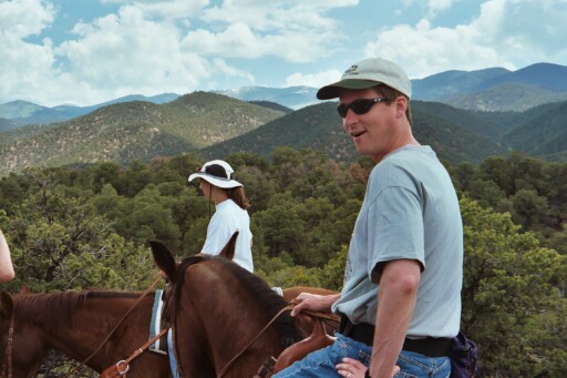Michael on his horse, Sarge. The horse trails are more or less in the hills at the back of the Bishop's Lodge. This shot is up at the top of one of the trails. Because he listened at the beginning of the ride, he managed to get Sarge to go backwards so he could take the picture of Jennifer on a previous page. |